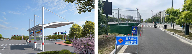 新建遮陽擋雨棚項目效果圖(左)與現(xiàn)場圖(右)