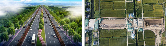東環(huán)路南延二期項目效果圖(左)與現(xiàn)場俯瞰圖(右)