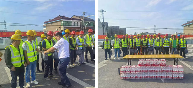 項目現(xiàn)場,張志軍詳細了解了項目作息時間、現(xiàn)場防暑降溫物資配備、高溫作業(yè)防護和安全生產(chǎn)措施等情況,并為每位施工人員分發(fā)了豐富的“清涼禮包”,包括礦泉水、藿香正氣水、人丹等一系列防暑降溫物品,承載著對工人健康與安全的深切關(guān)懷。他強調(diào),當(dāng)下正值高溫酷暑時期,各項目部要統(tǒng)籌做好各項安全生產(chǎn)工作,重點抓好高溫天氣的防暑降溫、安全防護措施和應(yīng)急處置等工作,合理安排作業(yè)時間,切實維護施工人員的職業(yè)安全和健康。