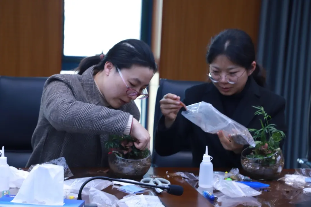 活動特邀專業(yè)指導師全程教學,指導老師詳細地向大家講解了微景觀的制作步驟和注意事項。在講師的耐心指導下,大家先在透明玻璃盆底部鋪上一層薄薄的小石子作為瀝水層,以確保植物能夠良好地生長;接著用種植土填滿盆內(nèi)的大部分空間,為綠植提供充足的養(yǎng)分;隨后,大家小心翼翼地將綠植放入盆中,根據(jù)自己的審美和創(chuàng)意,將植物擺放成高低錯落的層次感;最后,在微景觀中增添一些可愛的卡通玩偶,讓整個景觀顯得更加生動有趣。在輕松歡快的空間里,全體女職工放下工作壓力,以巧思妙想構(gòu)筑春日盛景,一盆盆綠植在女職工們的指尖流轉(zhuǎn)成詩意盎然的藝術佳作。